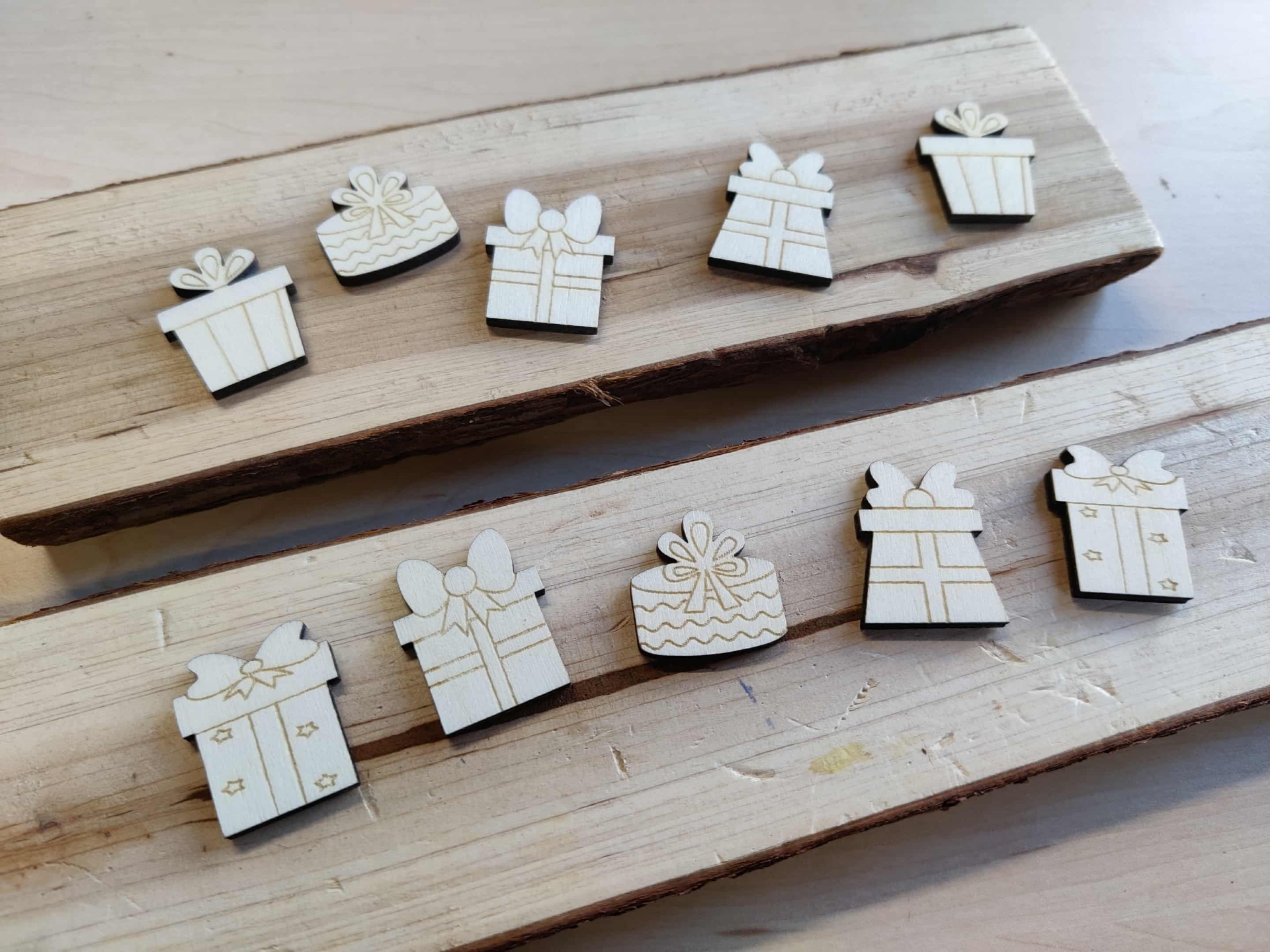 10 Houten cadeautjes (+/- 3x2,5x0,3 cm)