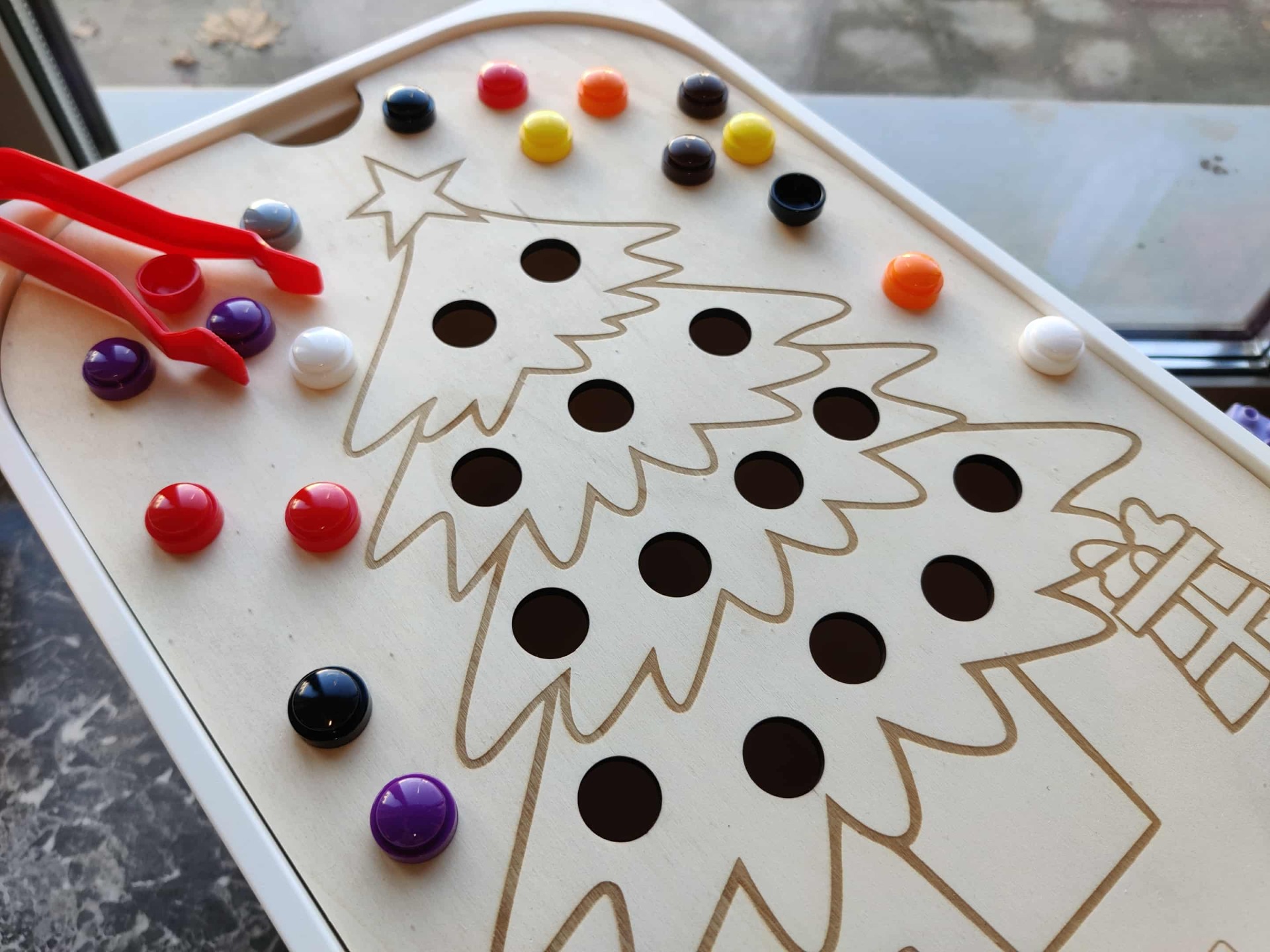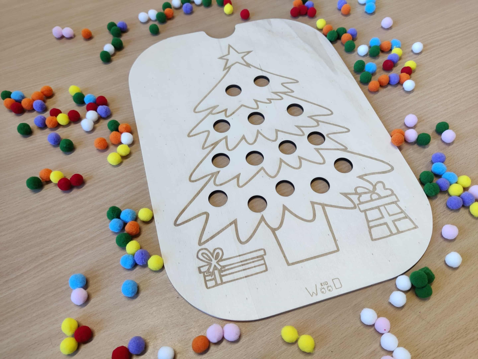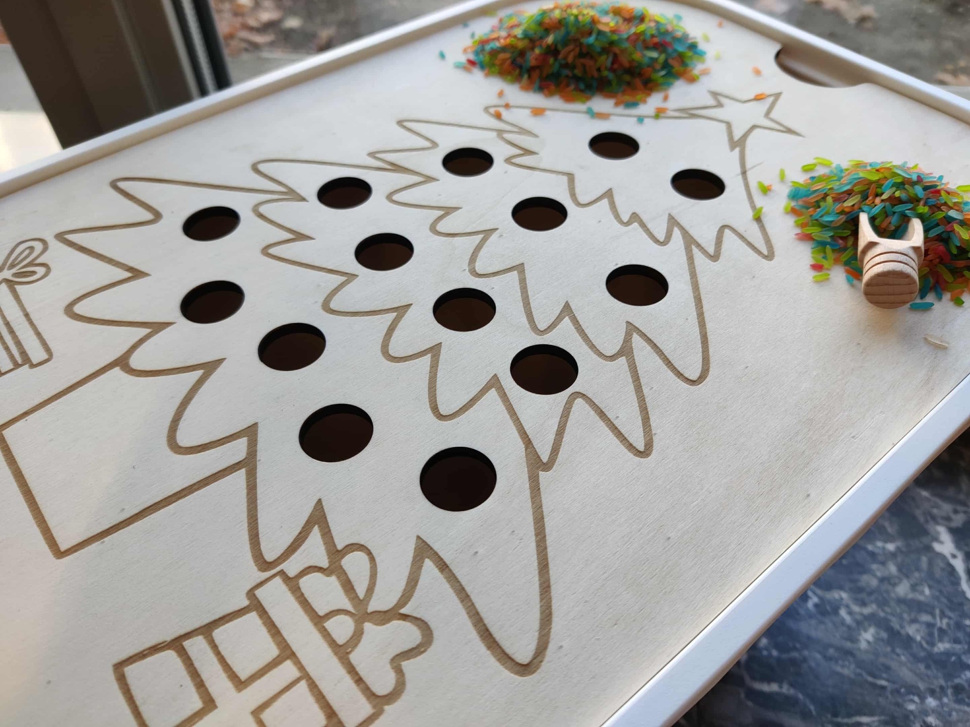 Versier de kerstboom met allerlei materialen door deze in de gaten te laten vallen.